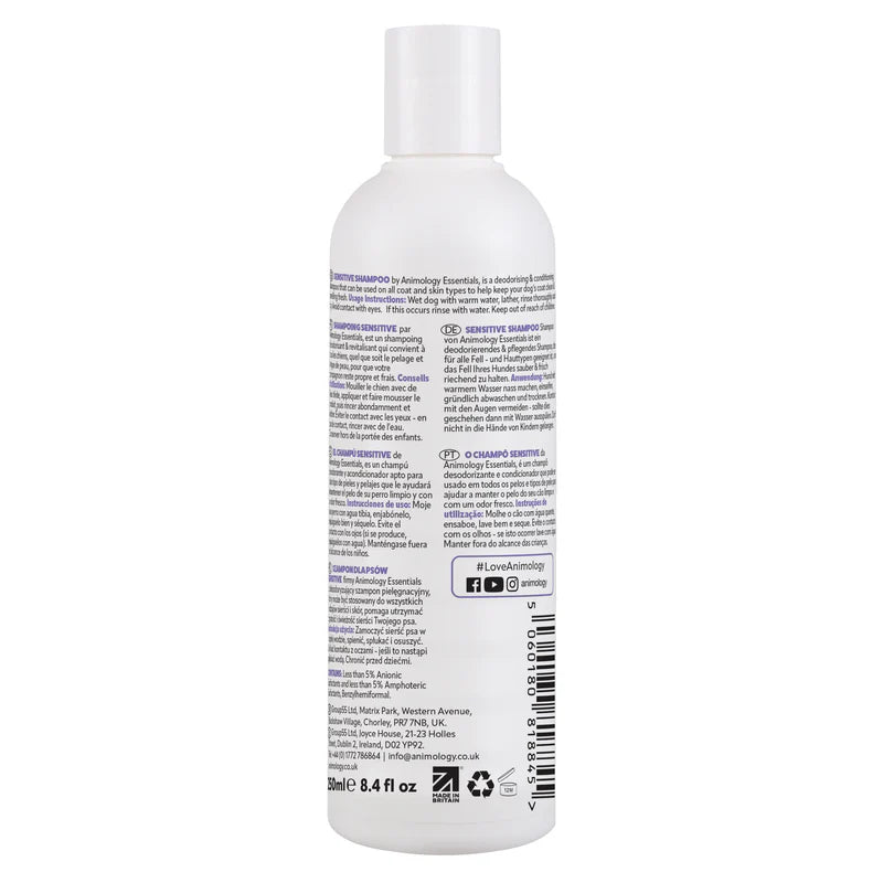 Sensitive Shampoo by Animology Essentials is a gentle, fragrance-free cleansing shampoo specially formulated for dogs with sensitive skin. This mild shampoo helps clean and condition the coat without irritation, leaving your dog feeling fresh, soft, and comfortable.