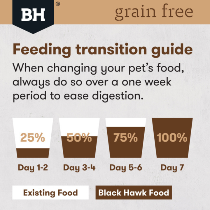 We are updating our Black Hawk Grain Free packaging to reflect the most up-to-date feeding information. The feeding amounts above may vary versus the information you see on pack, and we recommend you follow the recommendations given above.