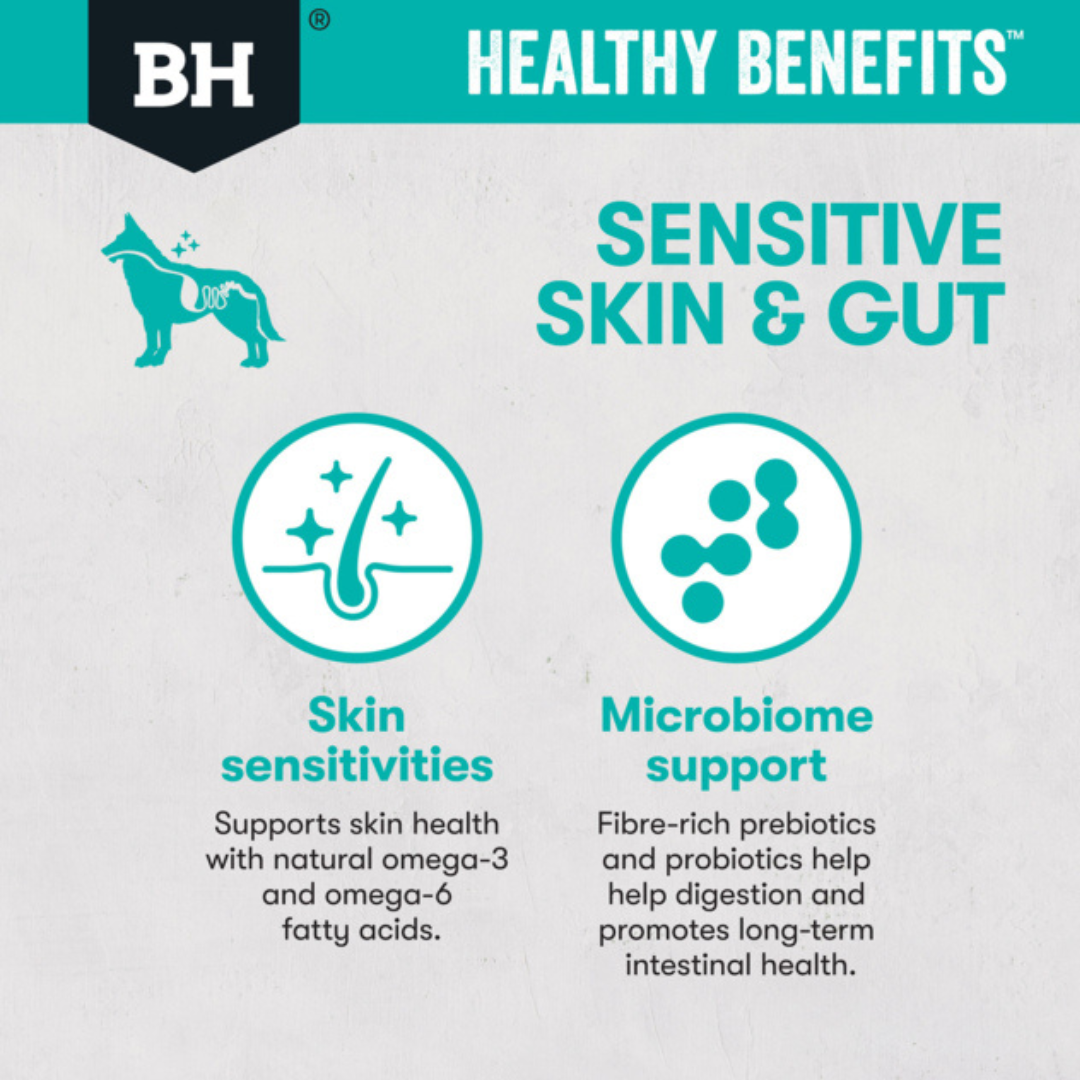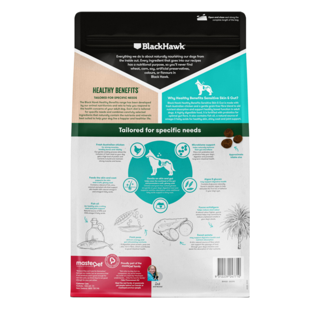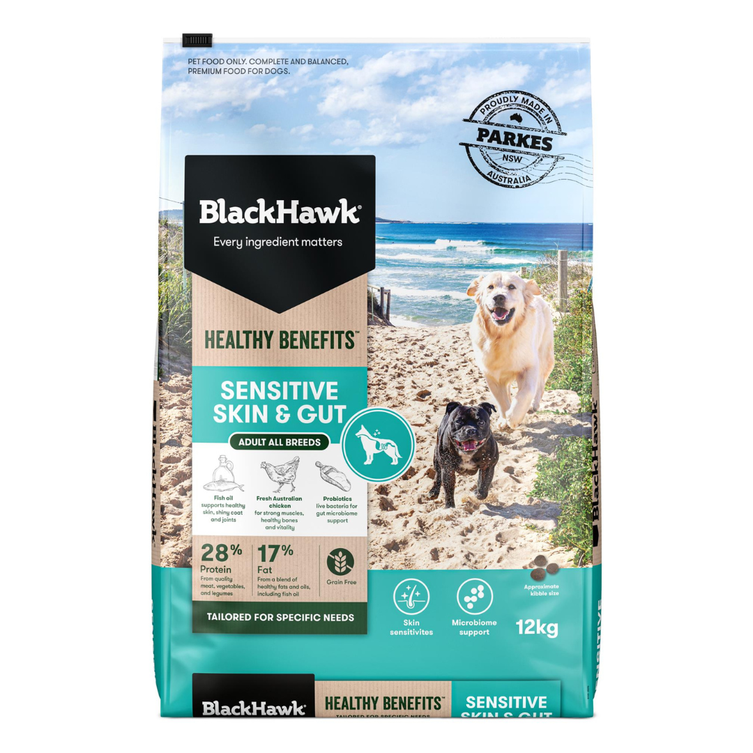 Black Hawk Healthy Benefits Sensitive Skin & Gut is made with fresh Australian chicken and a gentle grain-free fibre blend to aid nutrient absorption and support healthy bowel function in adult...