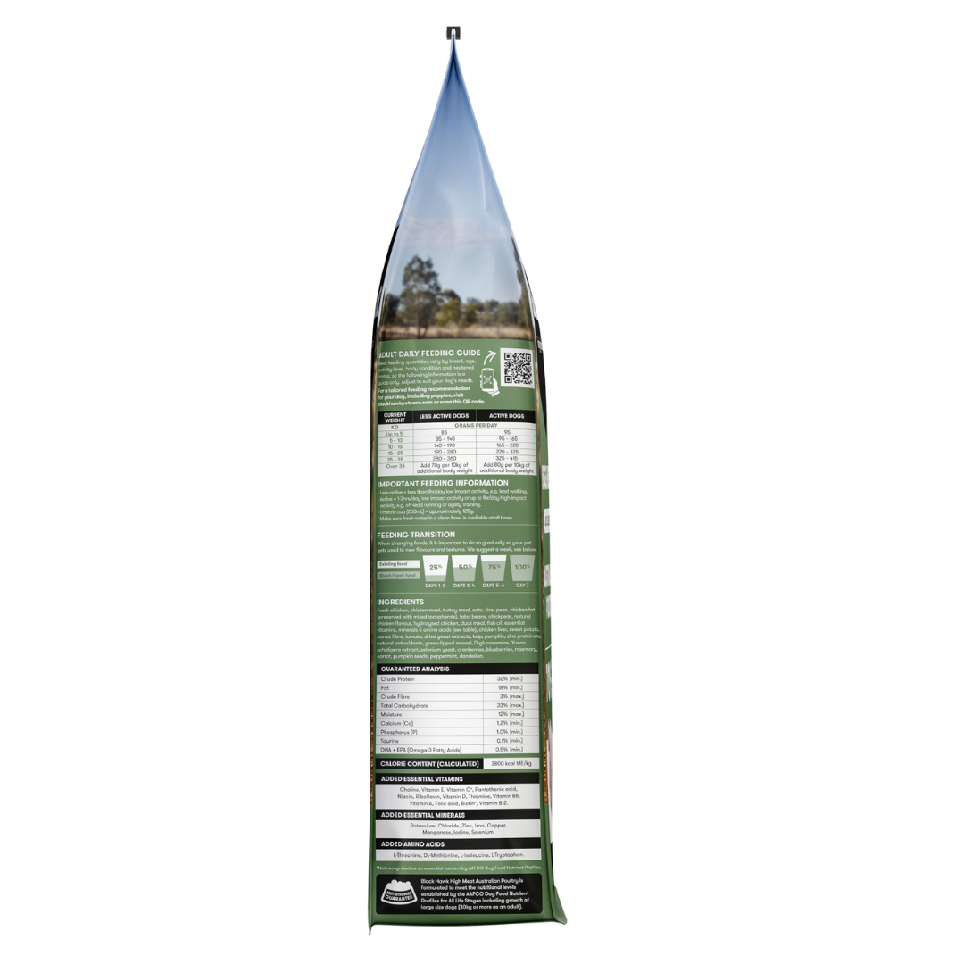 Black Hawk High Meat Australian Poultry Recipe is formulated to meet the nutritional levels established by the AAFCO Dog Food Nutrient Profiles for All Life Stages except for growth of large size dogs (30kg or more as an adult).