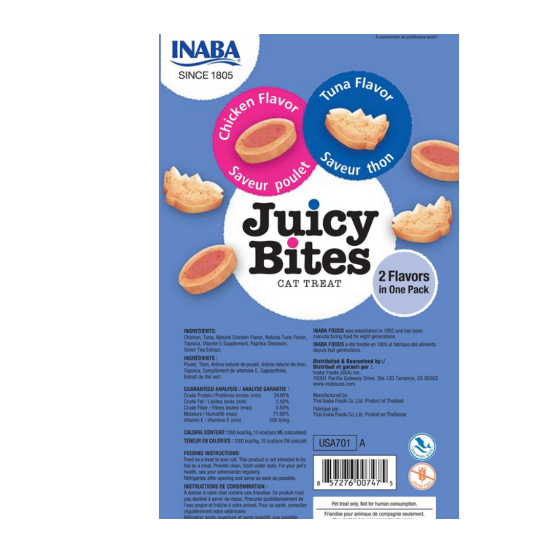 Juicy Bites are irresistibly moist, bite-sized soft tuna and chicken treats seasoned with natural flavours, green tea extract and vitamin E. No grains, preservatives or artificial colours.Each package includes three individual treat packs to maintain maximum freshness and each treat pack has two fun shapes in two different flavours to keep cats satisfied.